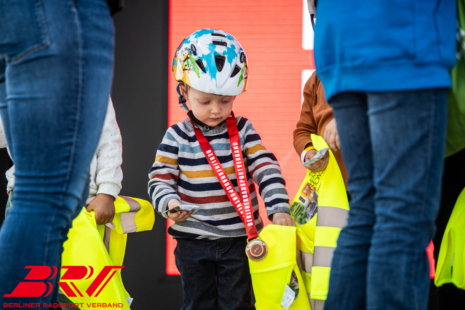 Ob Ella, Henry, Janosch, Paula oder Melli – alle Kinder waren mit großem Spaß dabei, es gab keine Stürze und keine Tränen. Am schnellsten im Ziel war standesgemäß ein Kind im Weltmeister-Trikot – der „Tadej Pogacar der Laufrad-Szene“, wie Moderator Sebastian Paddags scherzhaft meinte. Aber auch die Nachzügler im Ziel durften danach zur großen Siegerehrung mit auf die Bühne: dort gab es für alle Kinder eine Medaille, eine neongelbe Warnweste, eine mit Überraschungen gefüllte Trinkflasche und natürlich eine Urkunde. „Herzlichen Glückwunsch zu Deiner tollen Leistung! Du bist mit viel Spaß und voller Energie gefahren – weiter so!“ stand dort.